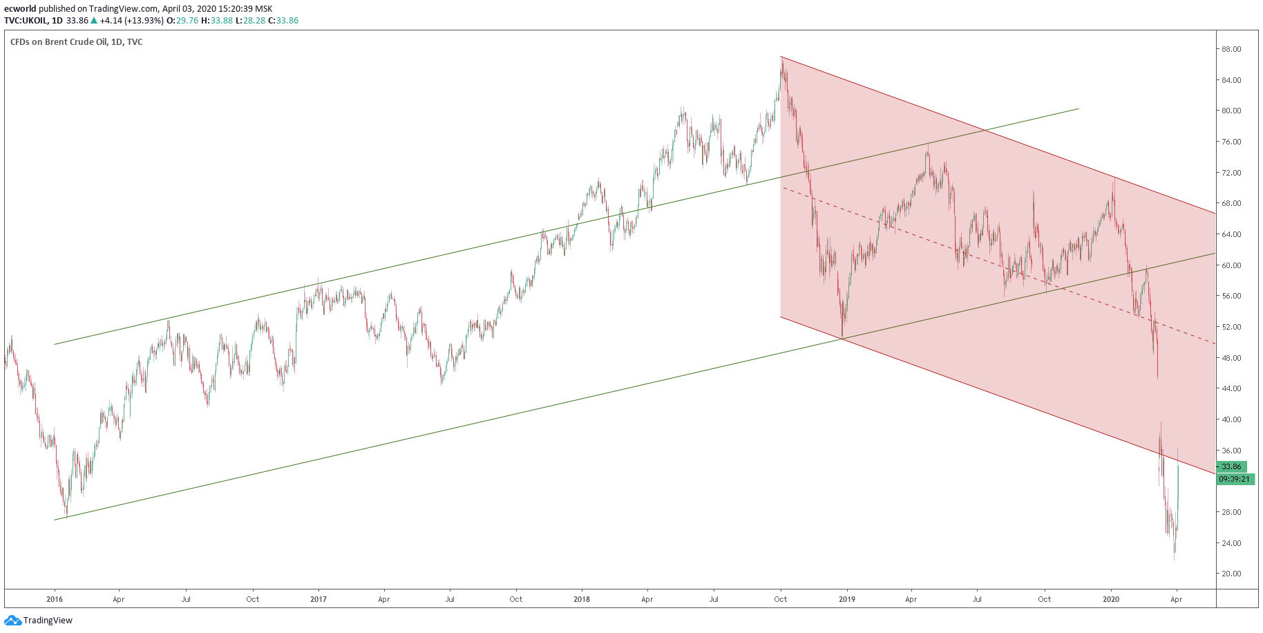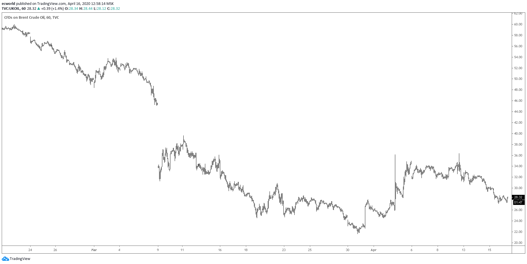 Как вы помните, в конце марта агентство argusmedia сообщало о том, что цена на российскую марку нефти в Северо-Западной Европе снизилась до минимального уровня с марта 1999 г. - $13 за баррель. После этого мы увидели твитты Д. Трампа и сообщения о том, что ОПЕК+ экстренно соберется для обсуждения дальнейших действий и возможного подписания нового соглашения. После этих новостей фьючерсы на нефть марки Brent подскочили за 10 минут на +37%: