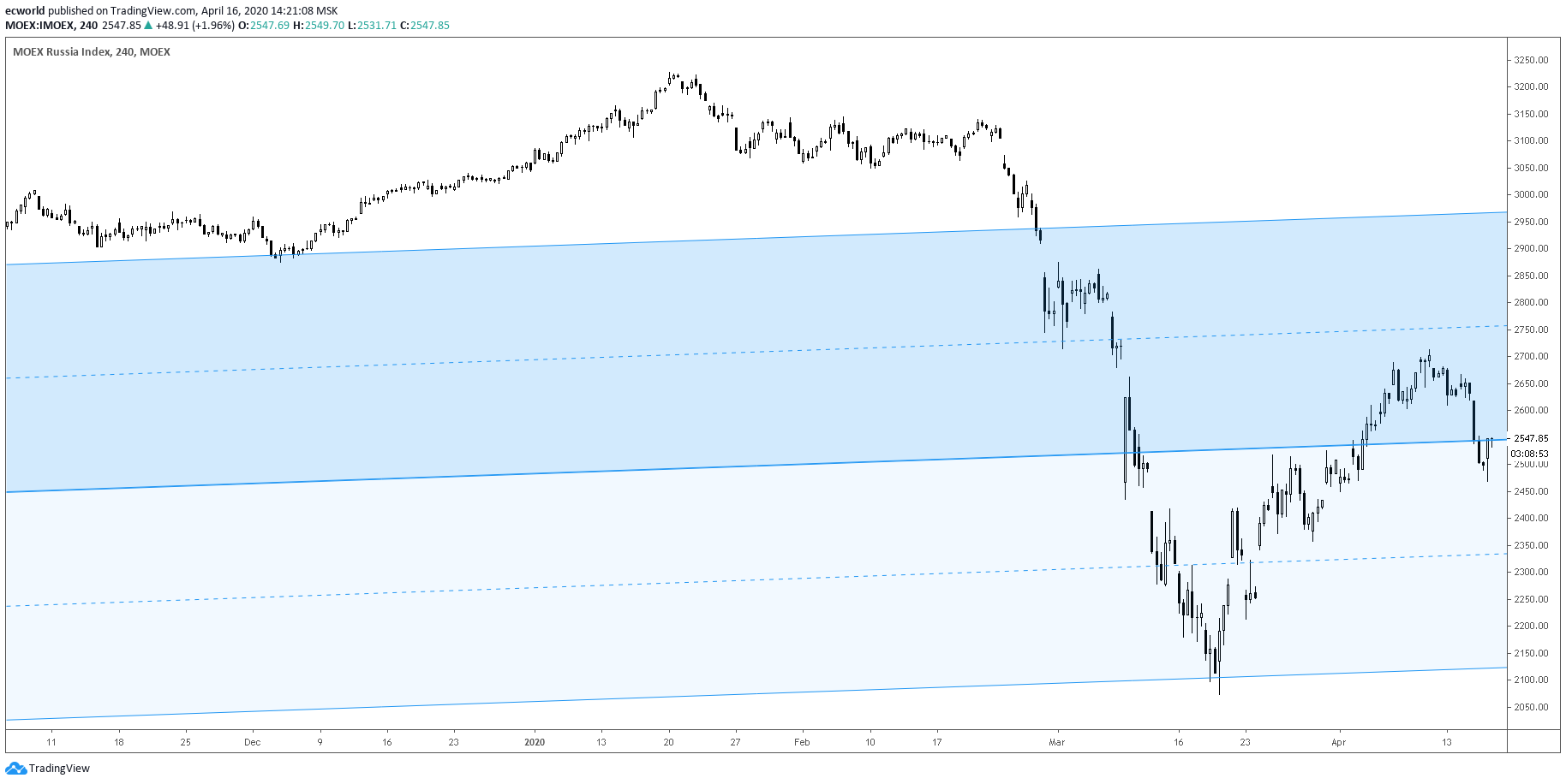 Как видите, происходит тест снизу нижней границы ранее пробитого вниз (на разрыве сделки ОПЕК+) канала.