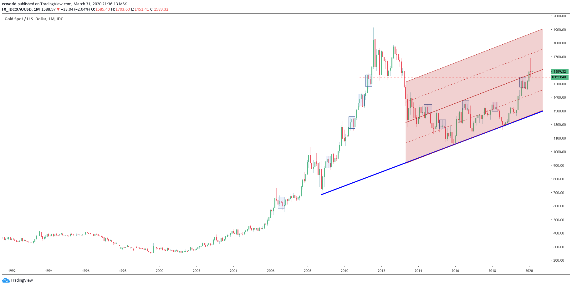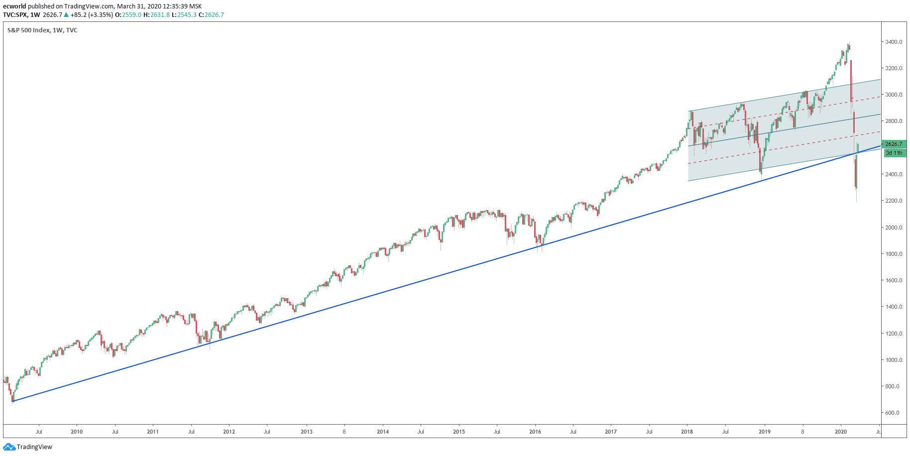 Основной фондовый рынок мира - в виде американского индекса SP - пока двигается в рамках нашего сценария от 18 марта, но с ускорением. SP достиг нижней границы производного среднесрочного канала (зеленым цветом на графике) и долгосрочной поддержки, даже на какое-то время зайдя в них.
