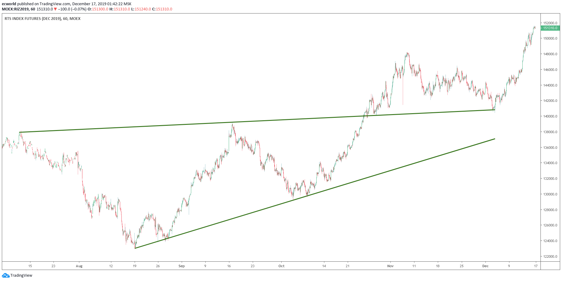 Фьючерс на индекс РТС за последние 2,5 недели декабря показал классическую динамику трендового растущего рынка: закрыли тень от 7 ноября, но не смогли пробить "важную зону поддержки" (ссылка) - что привело к отскоку и усилению импульса (лучшая характеристика трендового рынка):