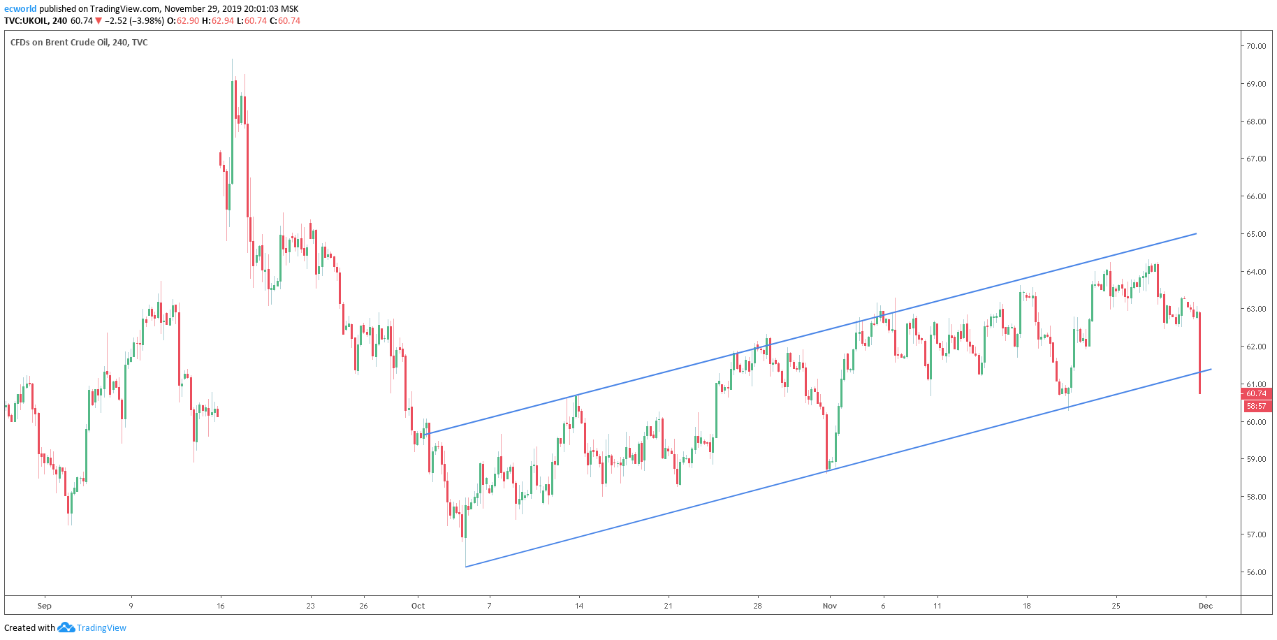 Нефть за 3 часа провалилась на -3,3% за заявлениях нашего министра энергетики и саудовской стороны относительно необходимости (есть сомнения) продлять сделку ОПЕК+ в марте 2020 года: