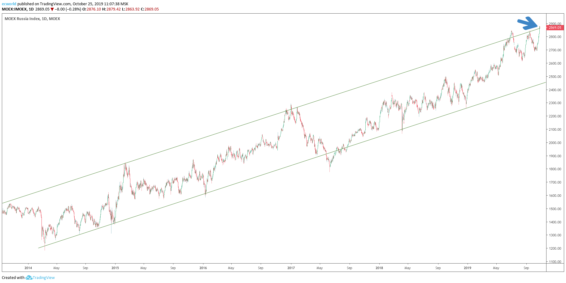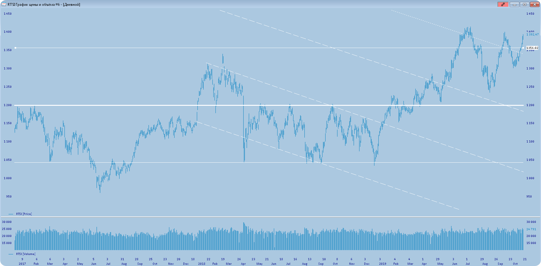 Российский индекс РТС после выхода из диапазона дошел до нашей первой точки в 1400 пунктов (ссылка) и показал рекорд длительности непрерывного роста за 2019 год. Сегодня РТС растет 8-ой день подряд: