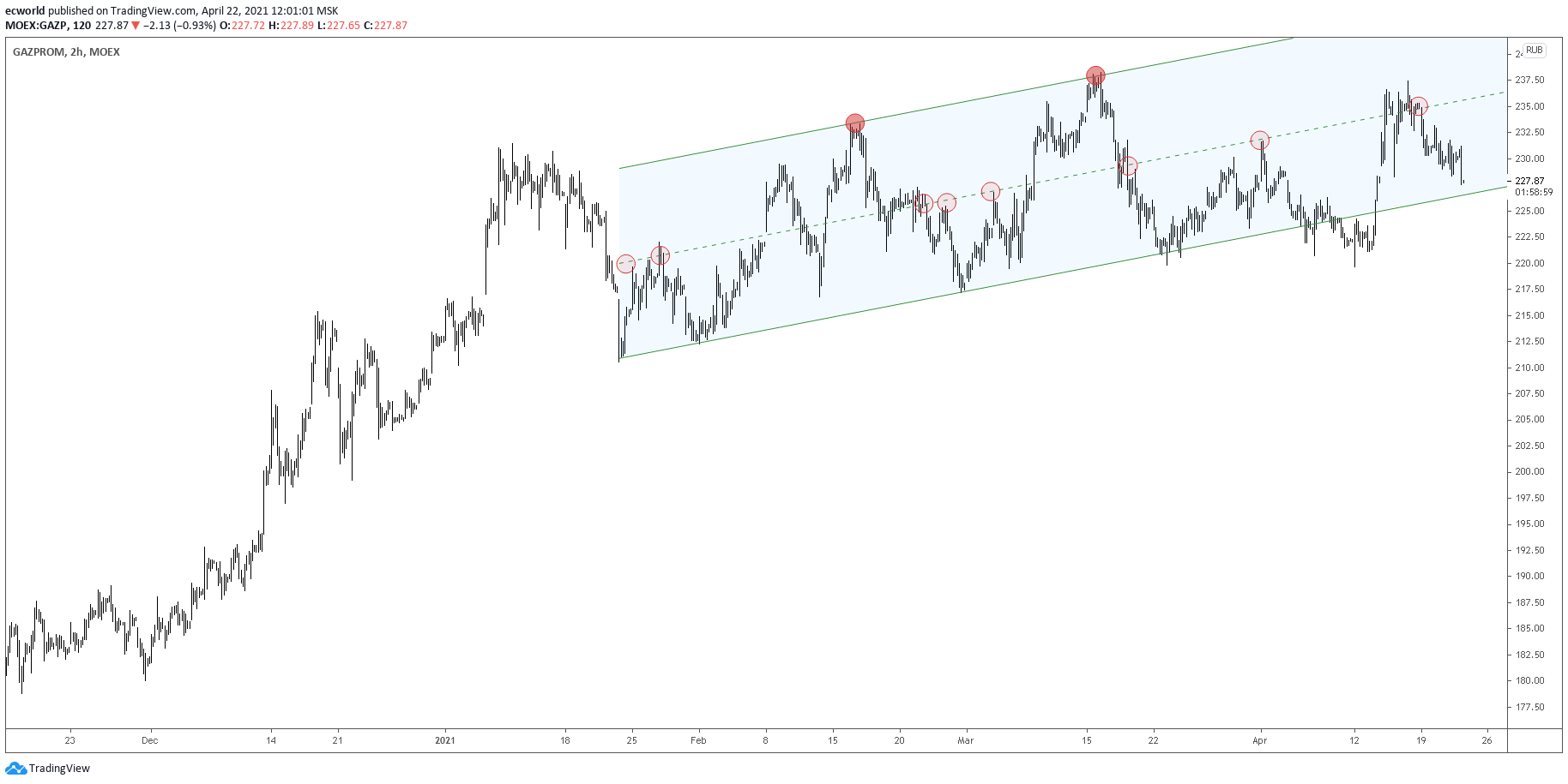 Риск пробоя растет (тут ключевые дни - до вторника - среды, когда рынок окончательно переварит обращение В. Путина - и в целом задаст направление). В случае пробоя цена пойдет тестировать ключевой уровень ~ 221 рубль. И тогда остается вопрос теста канала снизу. То есть выход из диапазона 227-221 рублей вниз приведет к тесту зоны 203-200 рублей: