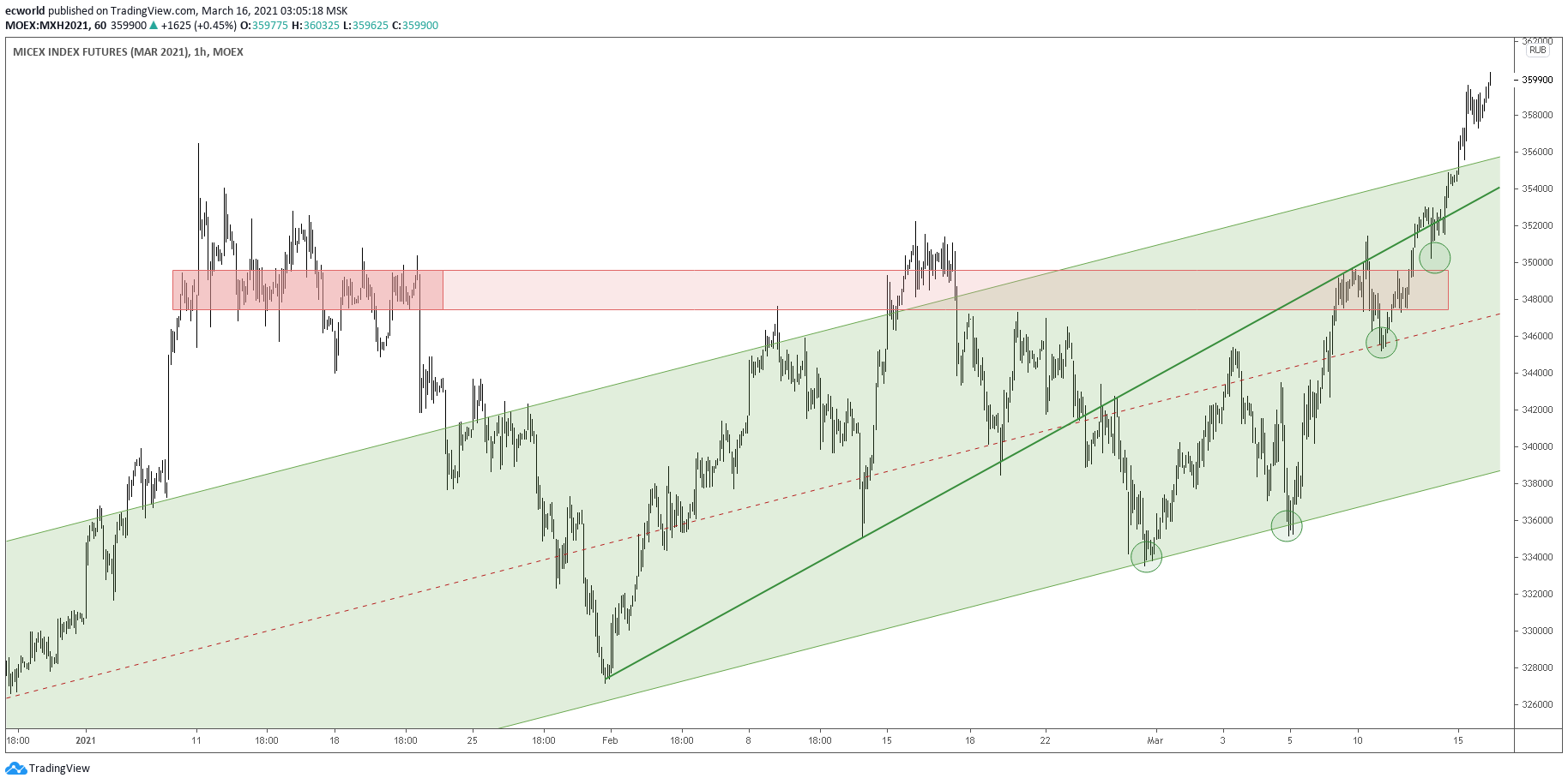 Обратите внимание, как технично работает ММВБ (по зонам, выделенным зелеными кругами, особенно хорошо это видно).