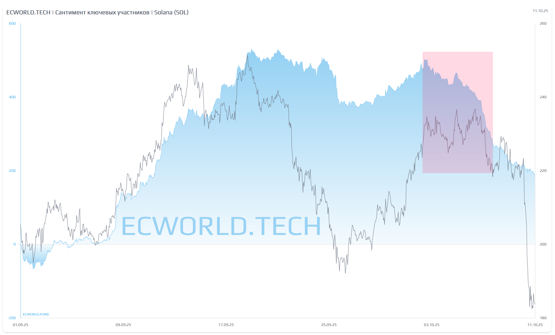Наши роботы фиксировали это: по голубой волне сантимента ниже на графике хорошо видно, как при более высоких цена (цена - в виде черной линии) происходит выход ключевых участников (инсайдеров). Голубая волна сантимента резко пошла вниз. Я подсветил для вас этот момент красным прямоугольником. В итоге вчера Solana была в пуле тех монет, которые падали намного сильнее других (видно, как черная линия цены через пару дней резко улетела вниз - это было вчера):