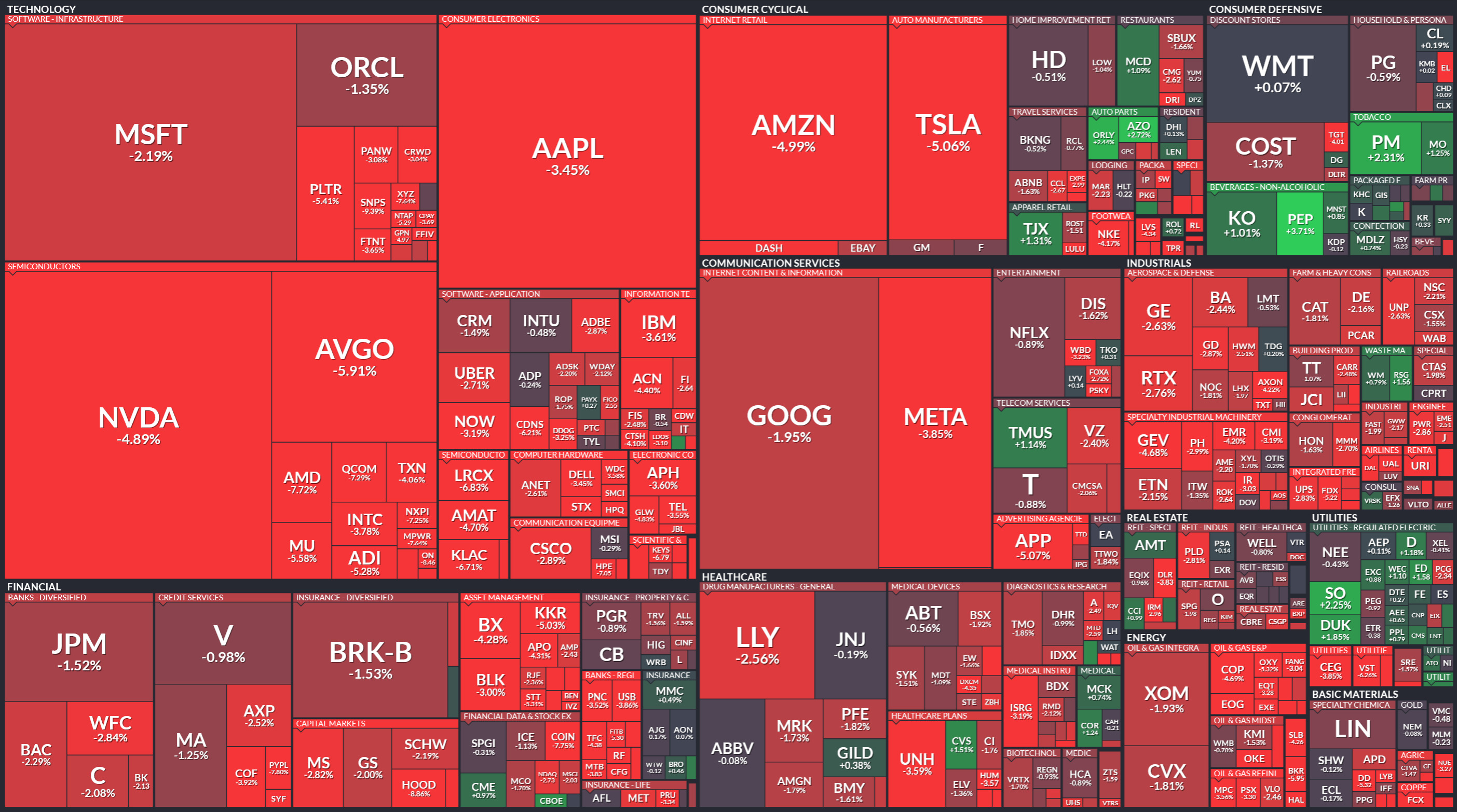 Сильнее других просел "технологический сектор", который рос в предыдущие месяцы и недели быстрее других на фоне развития инфраструктуры вокруг AI и большого количество сделок, связанных с OpenAI, разработчиком ChatGPT (раз, два, три). В итоге Nasdaq упал на -3,5%: