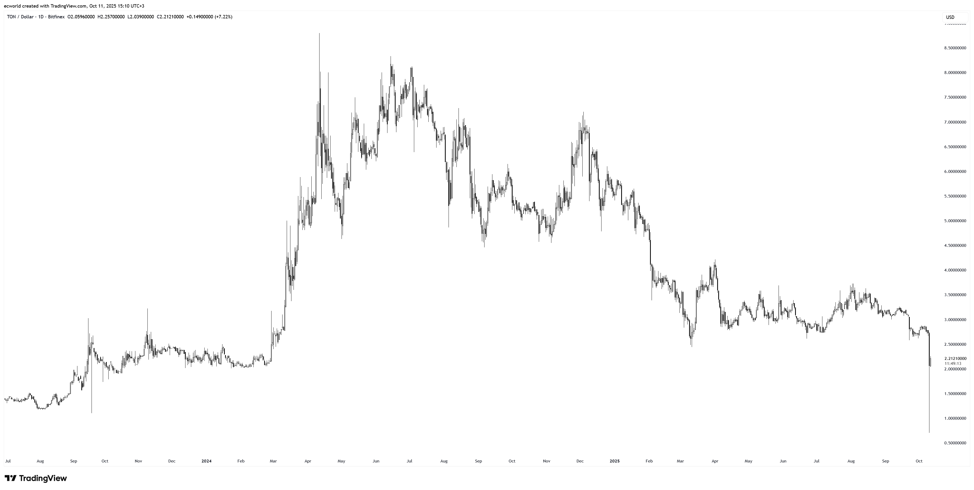 Потому что многие монеты упали на 30-80%, а потом с минимумов выросли в несколько раз. И одним из самых ярких примеров тут была как раз монета Павла Дурова - TON, которая в моменте падала почти на -80% и обновила исторические минимумы до $0,7: