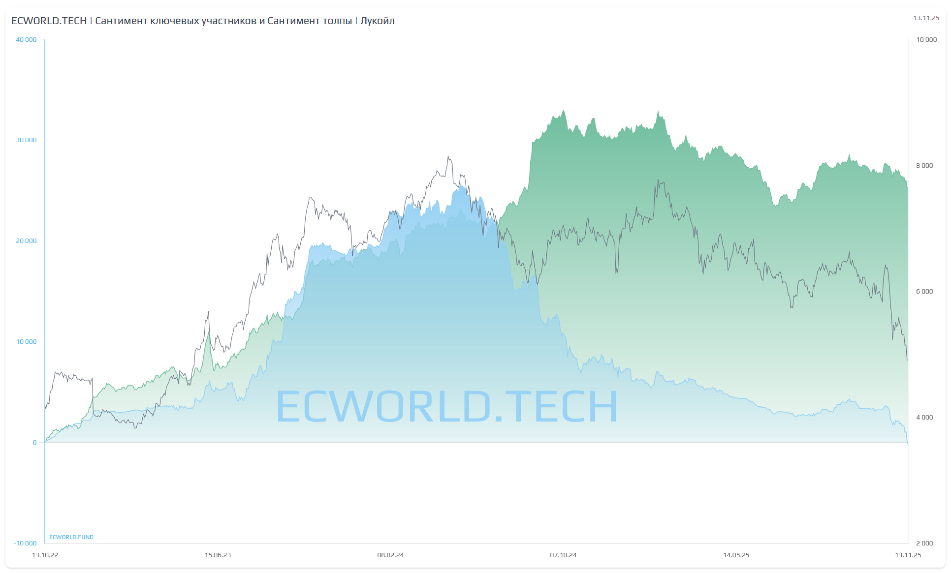 Я говорил об этом ранее много раз: поскольку "ребята" вышли, значит, заранее знают, что скоро Лукойл начнут "наказывать". Всё как в 2021 году (перед событиями 2022 года), когда мы смотрели на подобные действия ключевых участников и раздавали свои портфели с конца весны 2021 года и весь год, а физики тогда набирали и заносили в рынок вытаскиваемые из банков вклады - особенно массово с лета 2021 года.