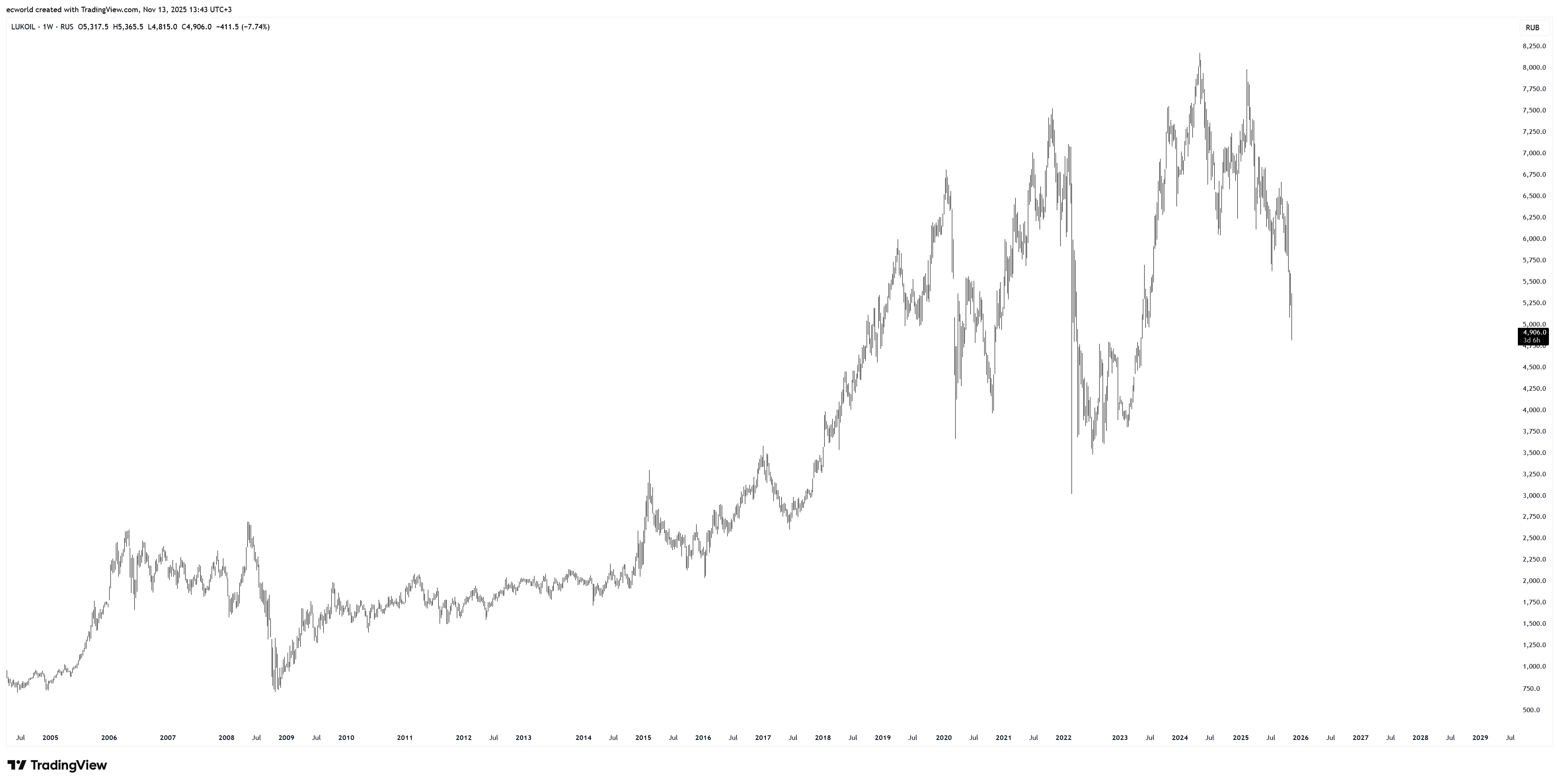 Лукойл сегодня утром обновил минимумы с мая 2023 года, упав почти на -2% (после вчерашних -4%). К текущему моменту акции вернулись к околонулевой отметке / динамике. При этом утренние объемы были настолько значительными, а паттерн выкупа нарисовал такие красивые "рельсы", что по старой привычке рука потянулась к кнопке "купить". Но мы сегодня поговорим не про спекуляции, а даже не про среднесрок, а про долгосрочное движение и события в этой акции, которые могут оказаться значимыми для всего российского рынка.